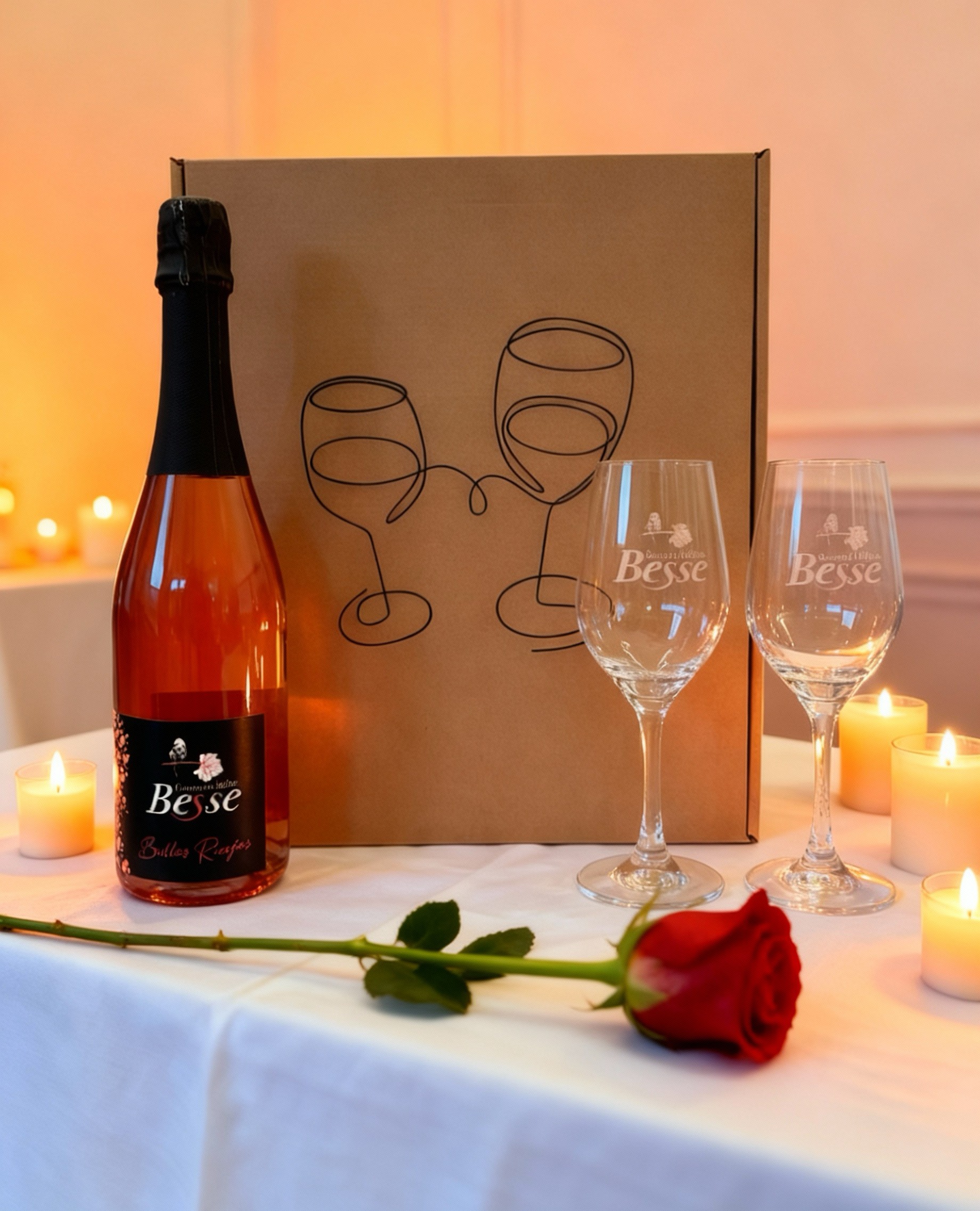Le coffret de la saint valentin se compose de la bouteille de votre choix à nous mentionner en commentaire, accompagnée de deux verres élégants assortis.